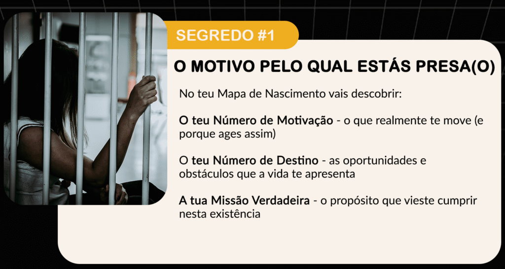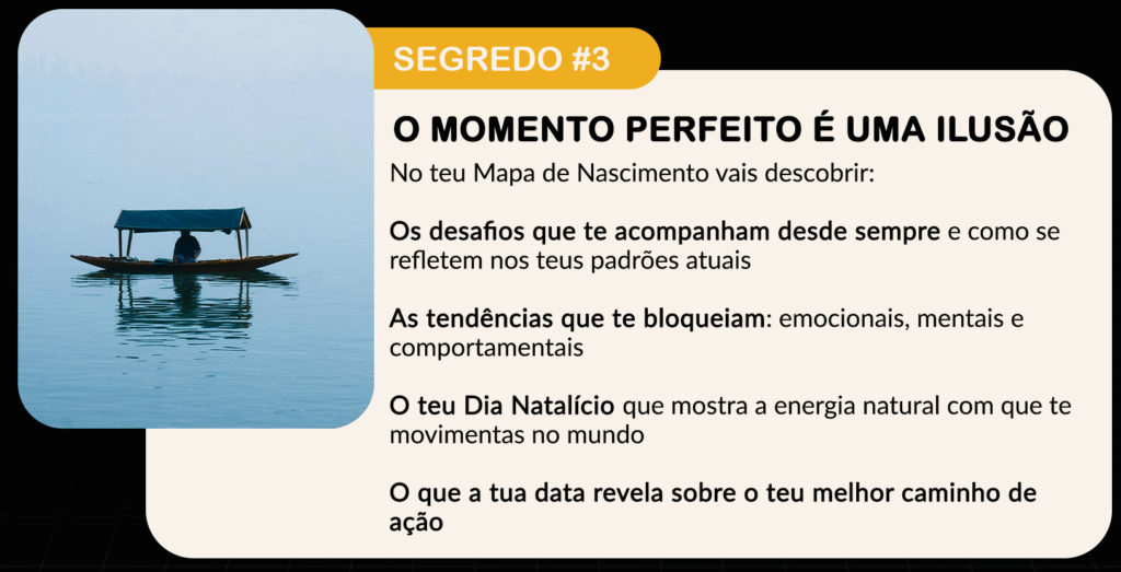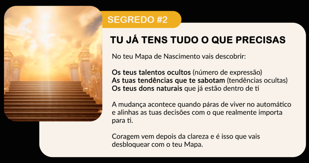 O Mapa de Nascimento mostra porque certos padrões se repetem na tua vida, o que está por trás dos teus bloqueios, quais são os teus talentos naturais, qual é o teu propósito de vida e qual é a direção certa para avançares.
