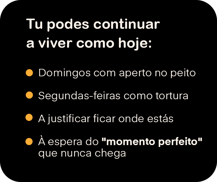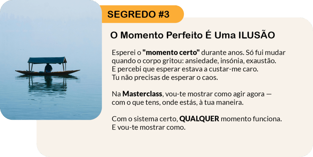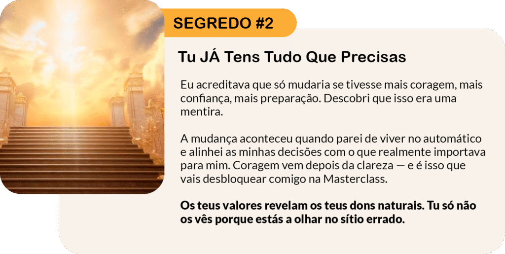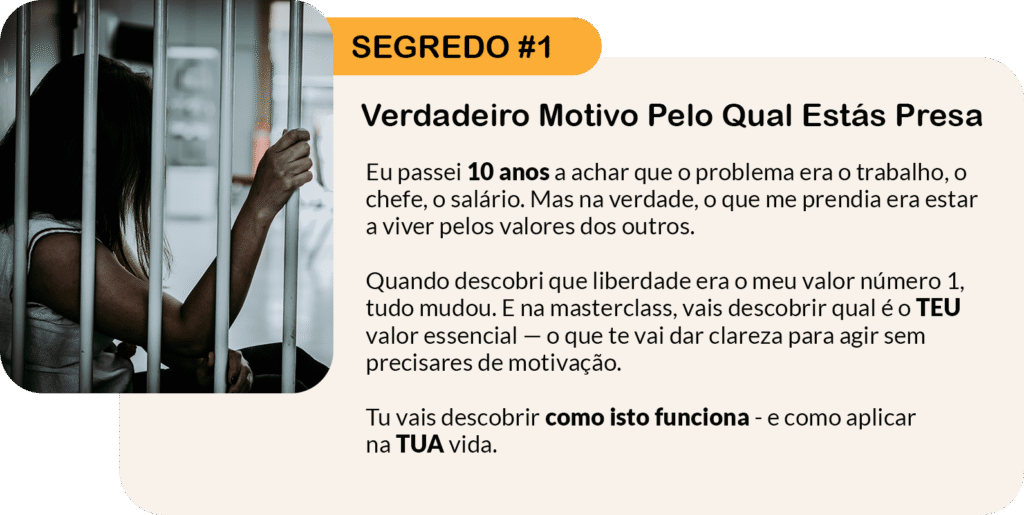 P.S. – Lembra-te: Durante 10 anos vivi exatamente onde tu estás. Sei a dor. Sei a frustração. Sei o medo. E sei EXACTAMENTE o que mudou tudo para mim. Deixa-me mostrar-te em 60 minutos. Tu mereces esta oportunidade. P.P.S. – A ferramenta que vais receber como bónus é a MESMA ferramenta que uso em sessões particulares. Só por isto, a Masterclass já vale a pena. Garante a tua vaga agora.